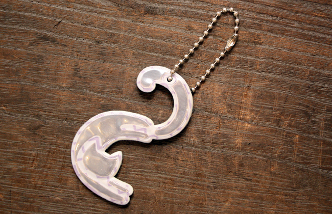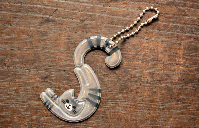 ねこちゃんががアルファベットのポーズを取っている、リフレクター素材のキーリングです。