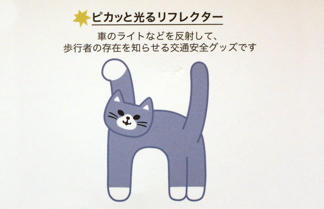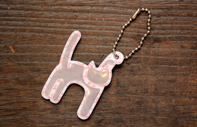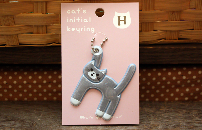 ねこちゃんががアルファベットのポーズを取っている、リフレクター素材のキーリングです。