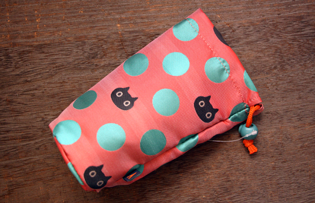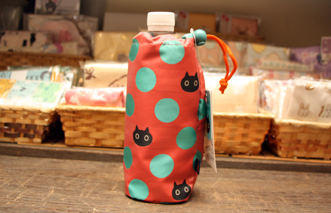 ぱっちりおめめのMEMEと大ぶりなドットのデザインがキュートなペットボトルケースです。