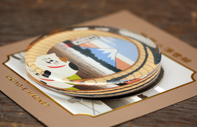 富士山が描かれた浮世絵の世界をまったりと旅する旅猫たちのマグネットです。