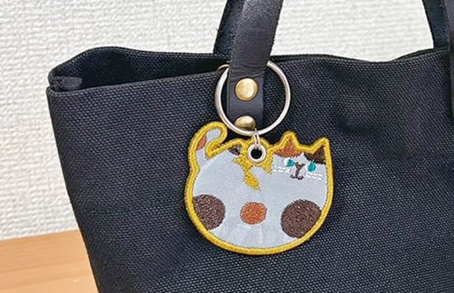 ライトを反射して光る、リフレクター生地を使った刺繍キーリングです。