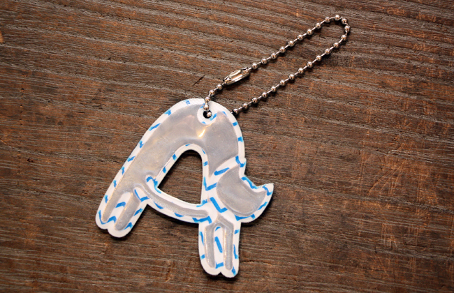 ねこちゃんががアルファベットのポーズを取っている、リフレクター素材のキーリングです。