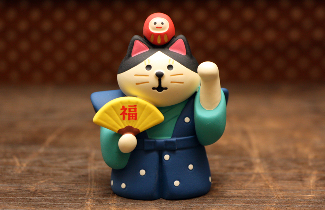 「いらっしゃいませにゃ〜」福助姿の招き猫。